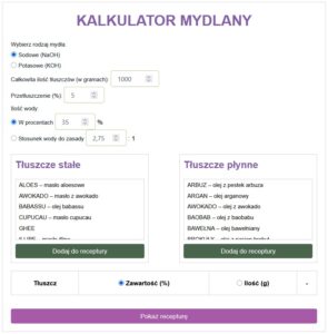 Jeśli zaczynasz swoją przygodę z tworzeniem mydeł i chcesz zoptymalizować swoje receptury, kalkulator mydlany będzie dla Ciebie niezastąpionym narzędziem. Wystarczy, że określisz w nim kilka parametrów oraz wybierzesz tłuszcze, jakich chcesz użyć do mydła, a on obliczy Ci odpowiednie proporcje potrzebnych składników. W artykule tym znajdziesz instrukcję, krok po kroku jak korzystać z Kalkulatora.