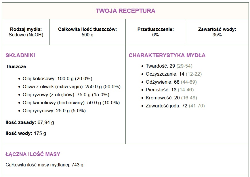 Jeśli masz doświadczenie w mydlarstwie – użyj KALKULATORA MYDLANEGO. A jeśli dopiero zaczynasz zabawę z tworzeniem własnych receptur i te słowa te brzmią dla Ciebie jak magia – nic się nie martw, po prostu ściśle trzymaj się podanych wyżej wartości.